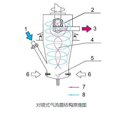氣流磨即氣流粉碎機(jī),他的工作原理是與旋風(fēng)分離器、除塵器、引風(fēng)機(jī)組成一整套粉碎系統(tǒng)。壓縮空氣經(jīng)過濾干燥后,通過拉瓦爾噴嘴高速噴射入粉碎腔,在多股高壓氣流的交匯點(diǎn)處物料被反復(fù)碰撞、磨擦、剪切而粉碎,粉碎后的物料在風(fēng)機(jī)抽力作用下隨上升氣流運(yùn)動(dòng)至分級(jí)區(qū),在高速旋轉(zhuǎn)的分級(jí)渦輪產(chǎn)生的強(qiáng)大離心力作用下,使粗細(xì)物料分離,符合粒度要求的細(xì)顆粒通過分級(jí)輪進(jìn)入旋風(fēng)分離器和除塵器收集,粗顆粒下降至粉碎區(qū)繼續(xù)粉碎。