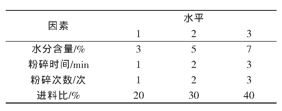 以單因素試驗(yàn)為基礎(chǔ), 設(shè)計(jì)因水平的正交試驗(yàn),選取水分含量、進(jìn)料比、粉碎時(shí)間、粉碎次數(shù)4 個(gè)因素對(duì)姜微粉碎工藝進(jìn)行進(jìn)一步考察, 以微粉碎后得到的姜細(xì)粉(粒徑<150μm)含量作為評(píng)價(jià)指標(biāo)。正交試驗(yàn)因素水平如表所示。