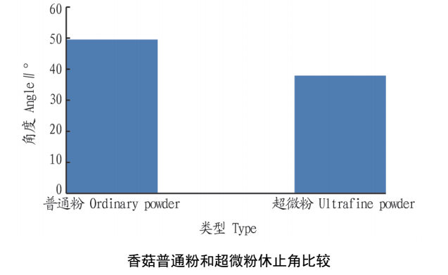通過比較粉體的休止角可以判斷其流動性,一般休止角越小,流動性越好。由圖 可知,香菇普通粉的休止角大于香菇超微粉的休止角,說明香菇普通粉比香菇超微粉的流動性差。這是因為隨著粒度的充分細化,顆粒間產(chǎn)生的摩擦力、靜電吸附力與分子間作用力等增大,因此容易發(fā)生團聚而形成大顆粒。這些大顆粒在重力等的作用下更容易滑下,使得粉體的流動性增大。