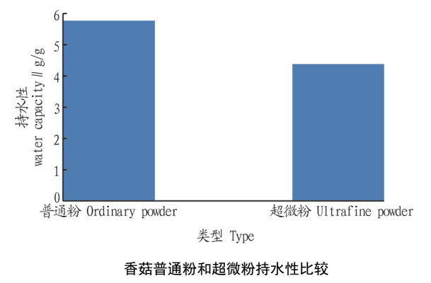 由圖可見,香菇普通粉和超微粉的持水性指數(shù)存在顯著性差異 。這是因為隨著粉體粒徑的減小,粉體分子變小,其對水分子的束縛力也變小,因而持水能力下降。此外,超微粉碎后粉末,由于破壁效應,水溶性分子變多,也會使持水能力下降。