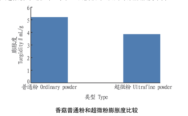 由圖 7可見,香菇普通粉和超微粉的持水性指數(shù)存在顯著性差異。與粉體變小持水性降低的原因一樣,小分子對于水分子的束縛力小,從而導致香菇超微粉比普通粉的膨脹度差。也可能是香菇在超微粉碎過程中,纖維組織被破壞,從而導致膨脹度下降。