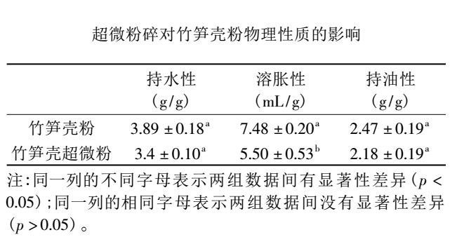 纖維具有較好的持水性、溶脹性和持油性。本實(shí)驗(yàn)考察了超微粉碎對竹筍殼粉上述性質(zhì)的影響。由表可知,經(jīng)超微粉碎機(jī)超微粉碎后竹筍殼粉的持水性、持油性沒有顯著性變化( p > 0.05) ,溶脹性顯著降低( p <0.05) 。機(jī)械摩擦力和剪切力改變竹筍殼粉體的物理結(jié)構(gòu)構(gòu)型導(dǎo)致溶脹性有所下降。這有兩個方面的原因: