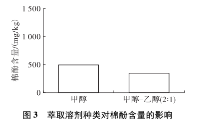 常溫下,將棉籽仁粉碎至120-250μm,按照料液比1:3添加正己烷,混合10min 后,進(jìn)行離心分離(4000 r/min、5 min) ,重復(fù)4次。將脫脂棉粕按照料液比 1:3分別與甲醇、甲醇-乙醇(2:1) 混合10 min 后,進(jìn)行離心分離( 4 000 r/min、5 min) ,重復(fù)提取3次,沉淀自然晾干,測定棉酚含量。結(jié)果見圖 3。