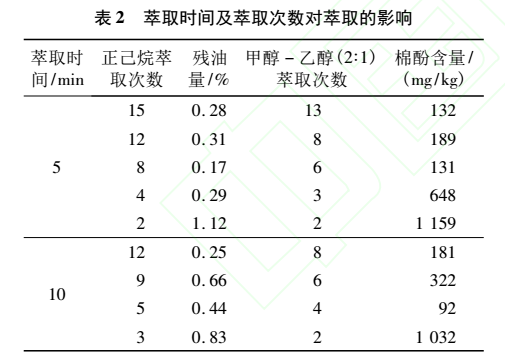 常溫下,將棉籽仁粉碎至120-180μm,分別按照料液比1:3添加正己烷,分別混合 5、10 min 后,進(jìn)行離心分離( 4 000 r/min、5 min) ,重復(fù)萃取。分離得到脫脂棉粕按照料液比1:3與甲醇-乙醇(2:1) 混合,分別混合5、10min 后,進(jìn)行離心分離(4000r/min、5min) ,重復(fù)萃取,沉淀自然晾干,測定殘油量、棉酚含量。結(jié)果見表 2。