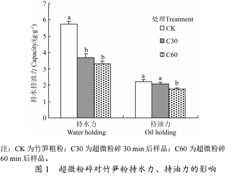 高膳食纖維食品的一般都具有較高持水、持油和溶脹的能力,從而起到減弱油膩,增強(qiáng)飽腹感等作用。從圖 1 可以看出,30、60 min 超微粉碎竹筍粉持水力明顯下降,持油力下降幅度不大,與麥麩超微粉持水力增強(qiáng)不同。由于超微粉碎破壞了竹筍的細(xì)胞結(jié)構(gòu),較大的纖維組織被破壞,導(dǎo)致竹筍超微粉主要為棒條狀,失去了粗粉的保水網(wǎng)狀結(jié)構(gòu),毛細(xì)吸水作用減弱,主要依靠溶脹吸水,導(dǎo)致持水力有所下降。持油性主要由竹筍中親油物質(zhì)所決定,超微粉持油力的小幅下降主要由于測量中,超微粉離心后更為緊密,顆?障蹲冃。址蹌t由于粒徑大,形狀不規(guī)則,離心后有更大空隙,從而使油脂填充其中,因此,超微粉碎對竹筍物料的持油力的影響小于持水力。從圖 1 中可知,雖然竹筍超微粉的持水力和持油力有不同程度下降,但仍可維持在一定水平,每克竹筍超微粉最低可吸收約 3.7 g 水分和 2 g 油脂,表明竹筍超微粉依然具有高持水能力和高吸油能力。