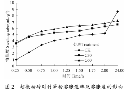 溶脹度主要顯示物料吸水后體積的變化情況,由圖 2 可知,竹筍超微粉在前 2 h 中溶脹度大小和溶脹速率明顯高于竹筍粗粉,超微粉在 0.25 h 溶脹度已達(dá)到最終溶脹度一半,在 0.75 h 以后溶脹度已達(dá)較高值,隨后溶脹度增加速度緩慢。竹筍粗粉溶脹度在 2 h 內(nèi)增速較慢。主要是由于超微粉粒徑小,比表面積遠(yuǎn)大于竹筍粗粉,與水接觸面積大,水分在顆粒中運(yùn)輸距離短,導(dǎo)致超微粉溶脹速度明顯增大。溶脹速率增大表明竹筍干超微粉的復(fù)水速率要明顯高于竹筍粗粉。在第 24 小時(shí),此時(shí)樣品溶脹達(dá)到飽和狀態(tài),竹筍粗粉溶脹度大于超微粉,主要原因是超微粉碎破壞了竹筍的細(xì)胞持水組織,持水力下降。結(jié)合持水力和溶脹度的變化,可以發(fā)現(xiàn)竹筍超微粉對水吸收量有所減小,可維持在 6.5~7 mL/g。因此,超微粉在一定程度上減弱高膳食纖維食物增強(qiáng)飽腹感這一特性,但可迅速增加飽腹感并維持一段時(shí)間。