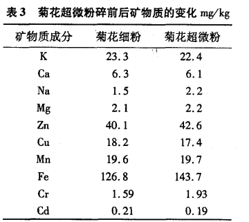 與常規(guī)細(xì)粉相比,菊花超微粉K、Ca、Cn、Cd的質(zhì)量分?jǐn)?shù)稍微降低,而Na、Mg、Zn、Mn、Fe、Cr的質(zhì)量分?jǐn)?shù)有所增加(表3)。說明超微粉碎對(duì)一般礦物質(zhì)成份的質(zhì)量分?jǐn)?shù)影響不大,Fe、Cr的質(zhì)量分?jǐn)?shù)增加明顯可能與超微粉碎中菊花與設(shè)備的接觸有關(guān)。