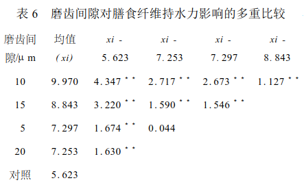 由表3可知,超微粉碎大大改善了膳食纖維的持水力,不過當(dāng)膠體磨間隙為5μm時,膳食纖維的持水力有所下降,這可能是膳食纖維的致密結(jié)構(gòu)遭剪切力的破壞,即使比表面積增大也無法抵消其破壞作用引起的持水力下降。從表4的方差分析可以得出,不同膠體磨磨齒間隙處理工藝之間的差異都達(dá)極顯著水平,采用新復(fù)極差法(見表5、表6)對各處理樣品之間的持水力進(jìn)行多重比較,膠體磨間隙5μm與20μm之間差異不顯著,其他各組之間差異極顯著,綜合來看采用10μm處理樣品效果最佳。