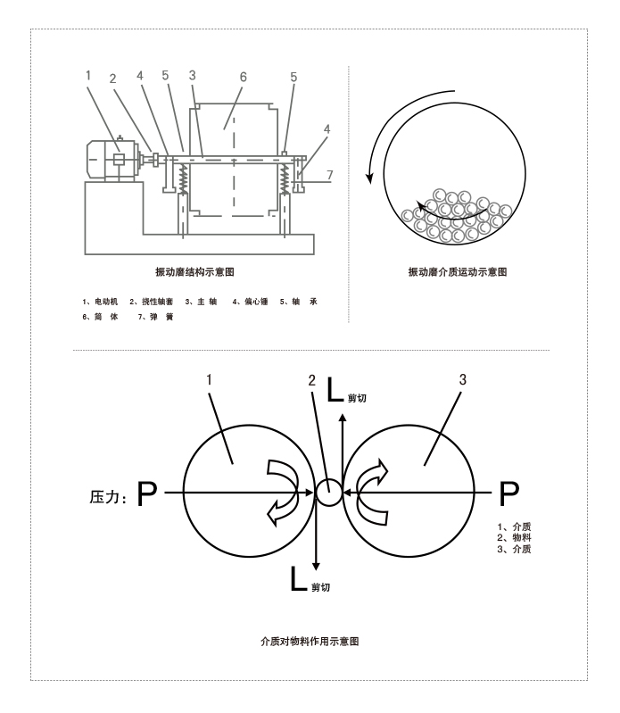 該設(shè)備采用振動粉碎的工作原理,在磨筒(粉碎室)中裝填一定量的研磨介質(zhì),如硬質(zhì)材料材料的球、棒或柱,磨筒在外加激振力的作用下產(chǎn)生順逆時針方向的圓振動。磨筒的強(qiáng)烈振動使磨筒內(nèi)的介質(zhì)產(chǎn)生拋擲運(yùn)動,在此拋擲運(yùn)動的作用下,使每個介質(zhì)都產(chǎn)生了與圓振動同向的旋轉(zhuǎn)運(yùn)動,與此同時,介質(zhì)群也產(chǎn)生3-5周與圓振動反向的低頻公轉(zhuǎn)運(yùn)動。于是介質(zhì)時而散開,時而互相沖撞,對物料產(chǎn)生正向沖擊力和側(cè)向剪切力。物料在P、L作用力的撞擊、壓縮和剪切作用下被研細(xì)、破壁粉碎。