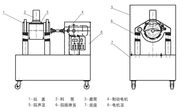 該設備采用振動粉碎的工作原理,在磨筒(粉碎室)中裝填一定量的研磨介質,如硬質材料材料的球、棒或柱,磨筒在外加激振力的作用下產生順逆時針方向的圓振動。磨筒的強烈振動使磨筒內的介質產生拋擲運動,在此拋擲運動的作用下,使每個介質都產生了與圓振動同向的旋轉運動,與此同時,介質群也產生3-5周與圓振動反向的低頻公轉運動。于是介質時而散開,時而互相沖撞,對物料產生正向沖擊力和側向剪切力。物料在P、L作用力的撞擊、壓縮和剪切作用下被研細、破壁粉碎。